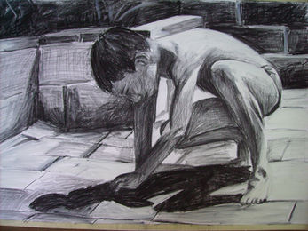 Materials: Charcoal, white charcoal, acrylic paint, gesso, pastels, black ink.