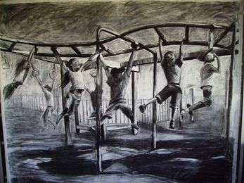 Materials: Charcoal, white charcoal, acrylic paint, gesso, pastels, black ink.